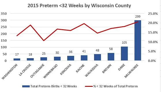 Ten counties make up 71% of the 987 premature births that were classified as "very preterm" or less than 32 weeks gestation. The blue bars indicate the number of very preterm births. The red line indicates the percent of the total. For instance, in Milwaukee County, there were 295 preterm births that were less than 32 weeks gestation. That number represents about 20% of the total preterm births (less than 37 weeks) in Milwaukee County.