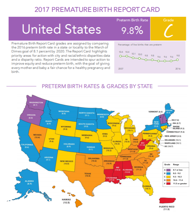 The March of Dimes' annual report card gives the United States and overall rating of "C." At a 9.6% premature birth rate, Wisconsin is also given a rating of "C." This is a downgrade from 2016 when Wisconsin was given a rating of "C" with a 9.4% premature birth rate.
